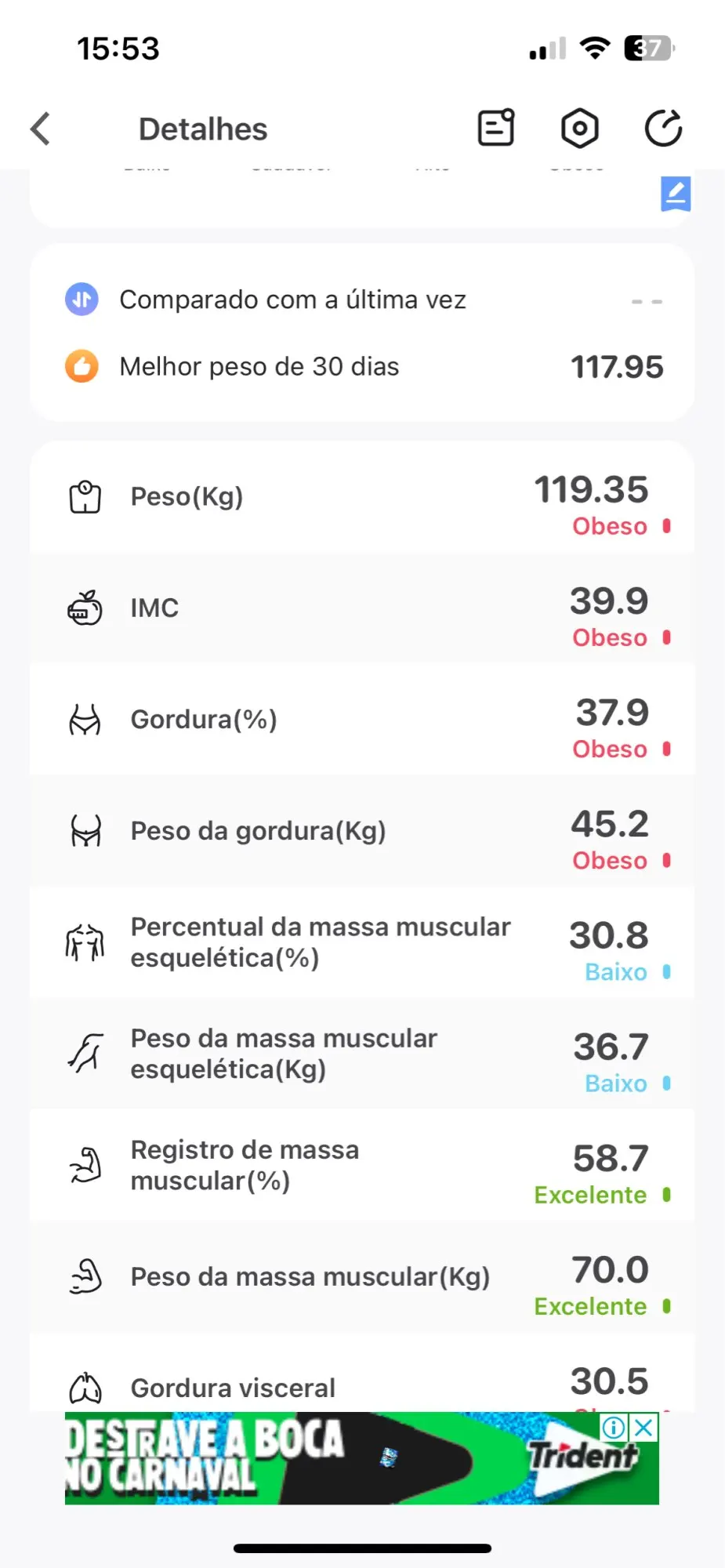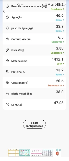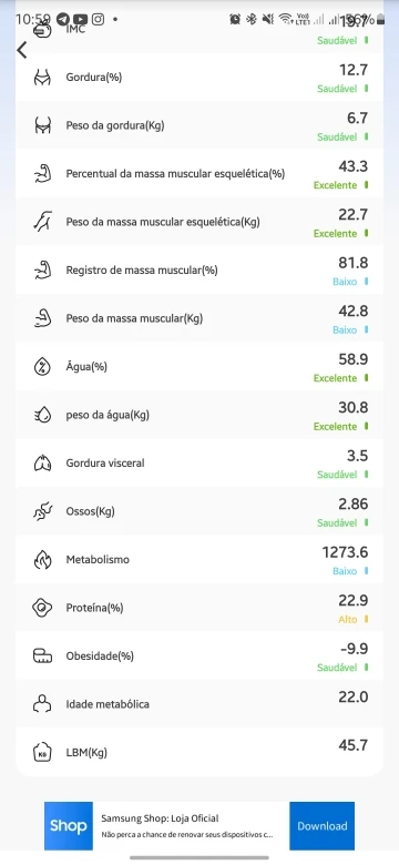 Água, Gordura Visceral, Ossos, Metabolismo, Proteína, Obesidade, Idade Corporal e LBM