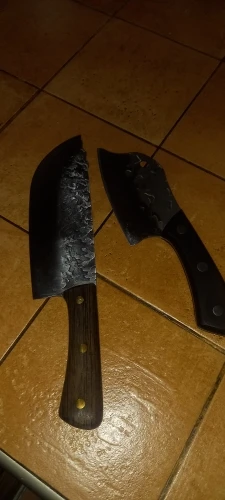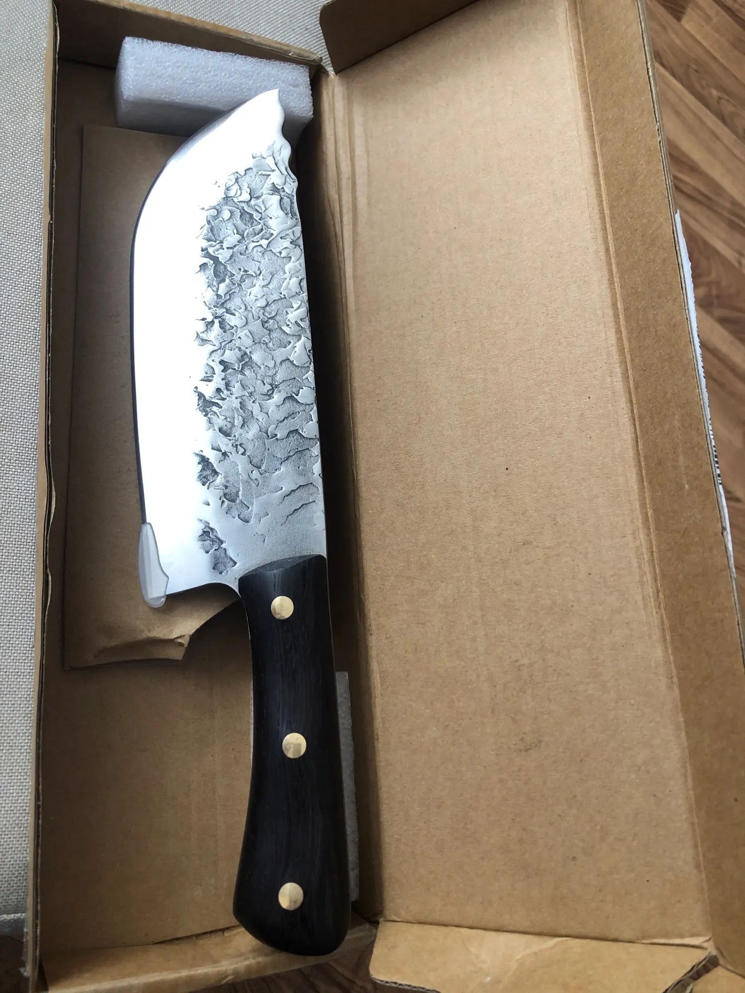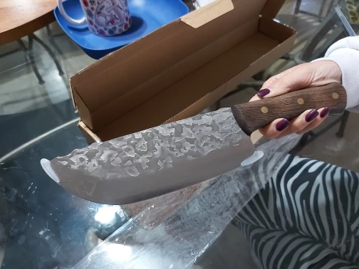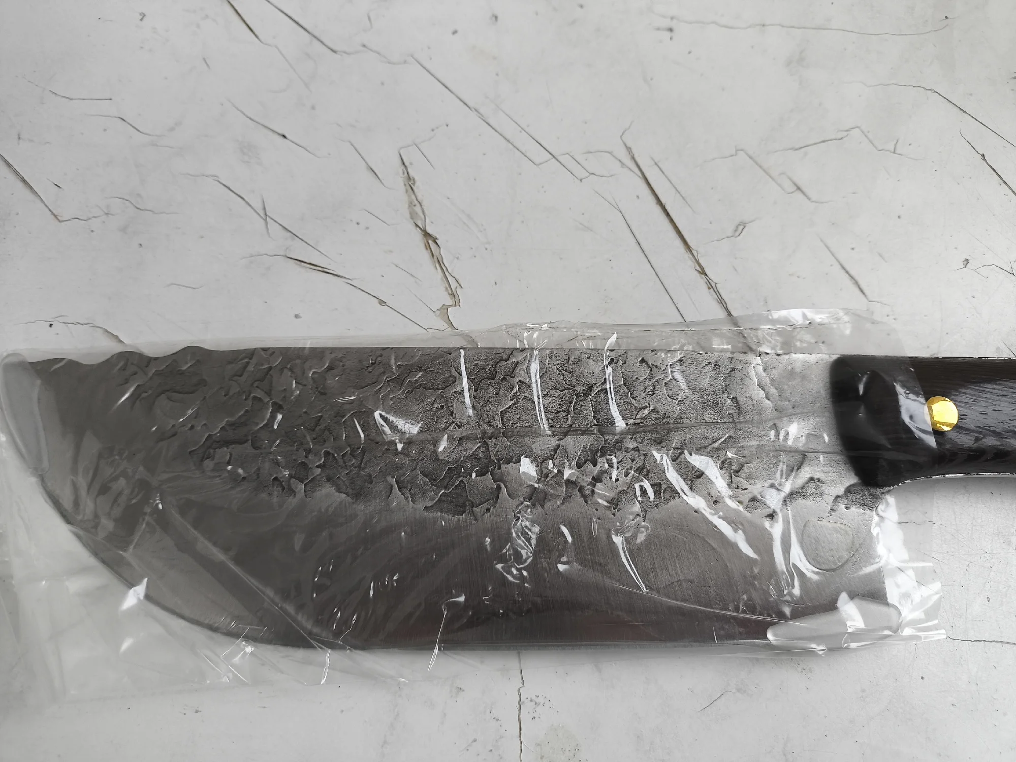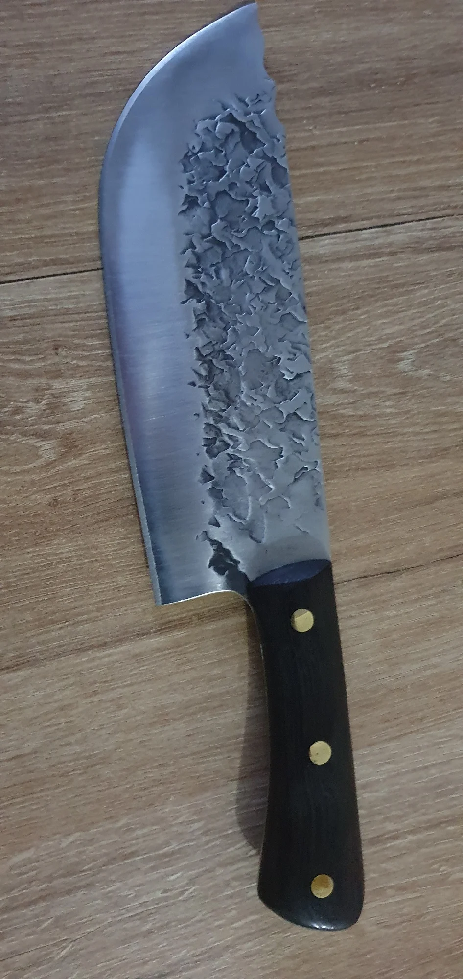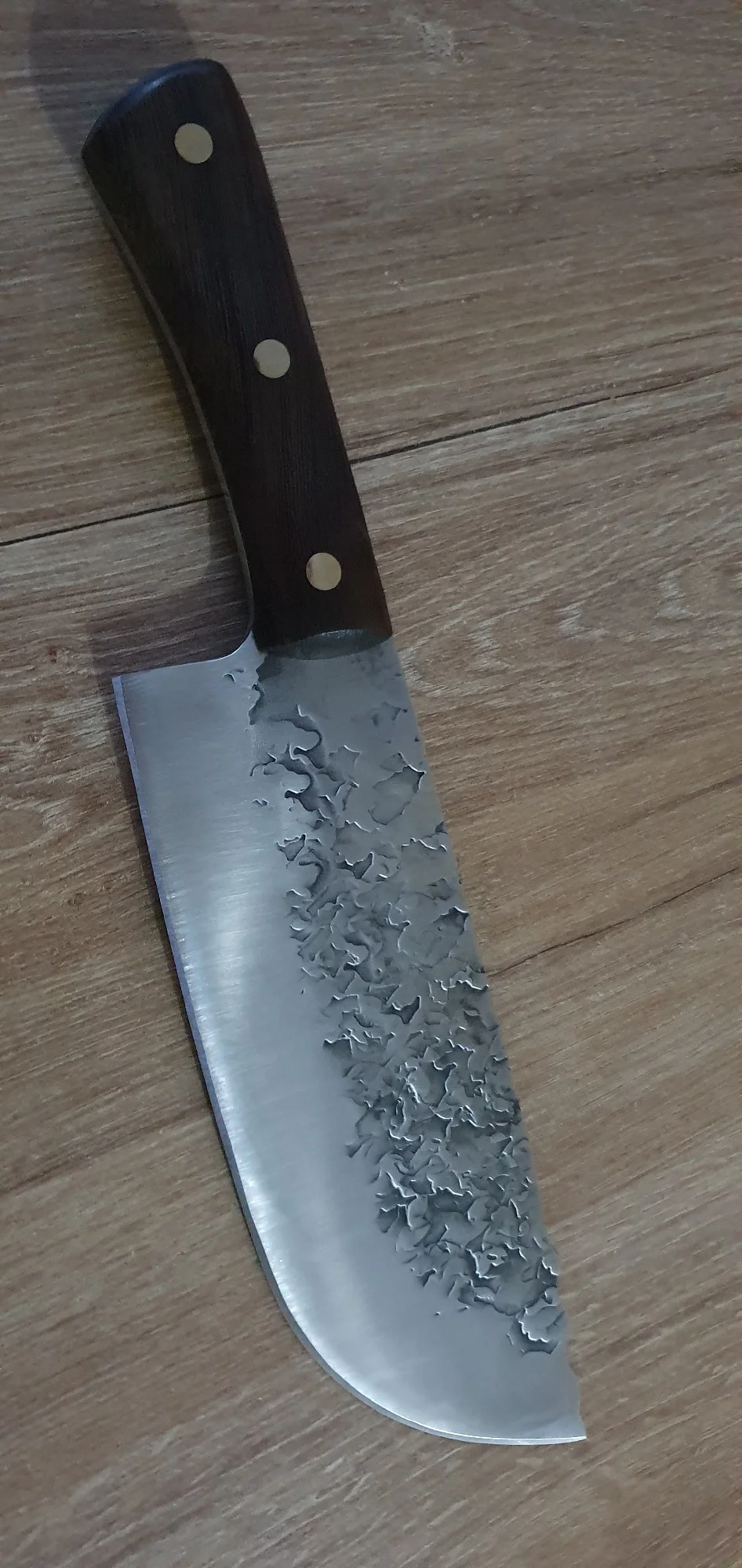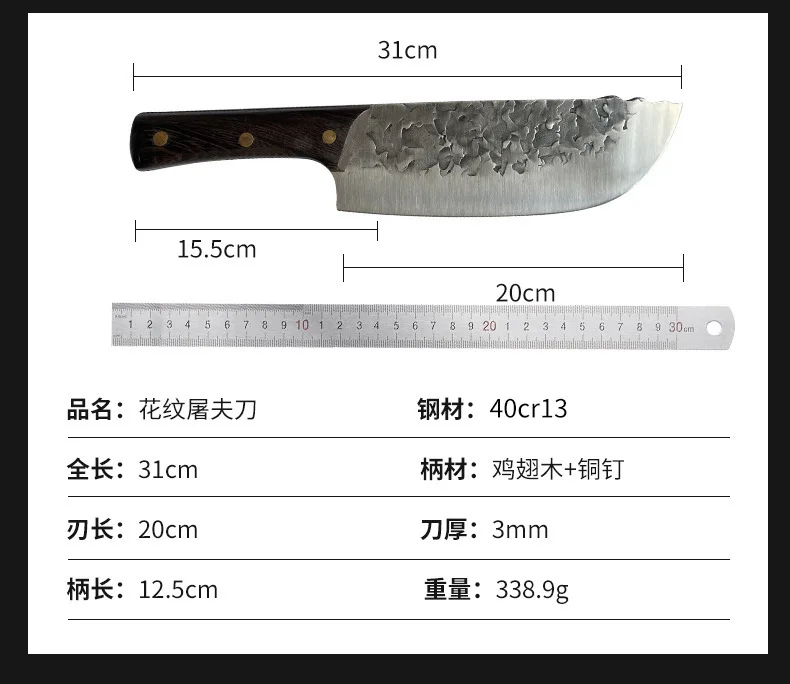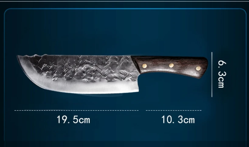 | DescriçãoComprimento total: 29,8 cm Comprimento da lâmina: 19,5 cm Comprimento da alça: 10,3 cm Espessura da lâmina: 2,8 mm Largura da lâmina: 6,3 cm Material da lâmina: aço inoxidável 5Cr15Mov Dureza da lâmina: 58±2HRC Acabamento da lâmina: forjado à mão Cabo: Fixação de madeira e rebite Peso: cerca de 319g Outros: faca de cozinha forjada chinesa Uso: fatiar carne, cortar vegetais, facas de cozinha de açougueiro e chef