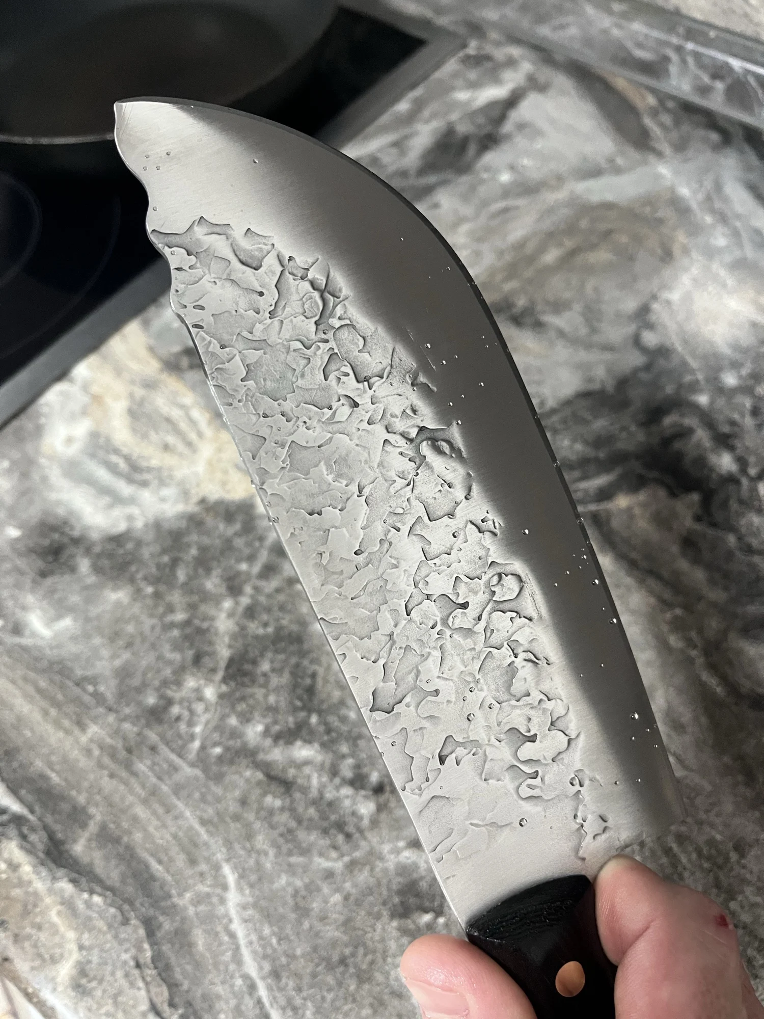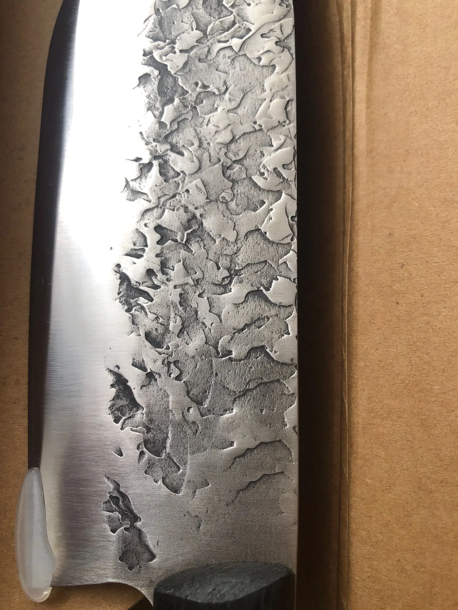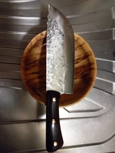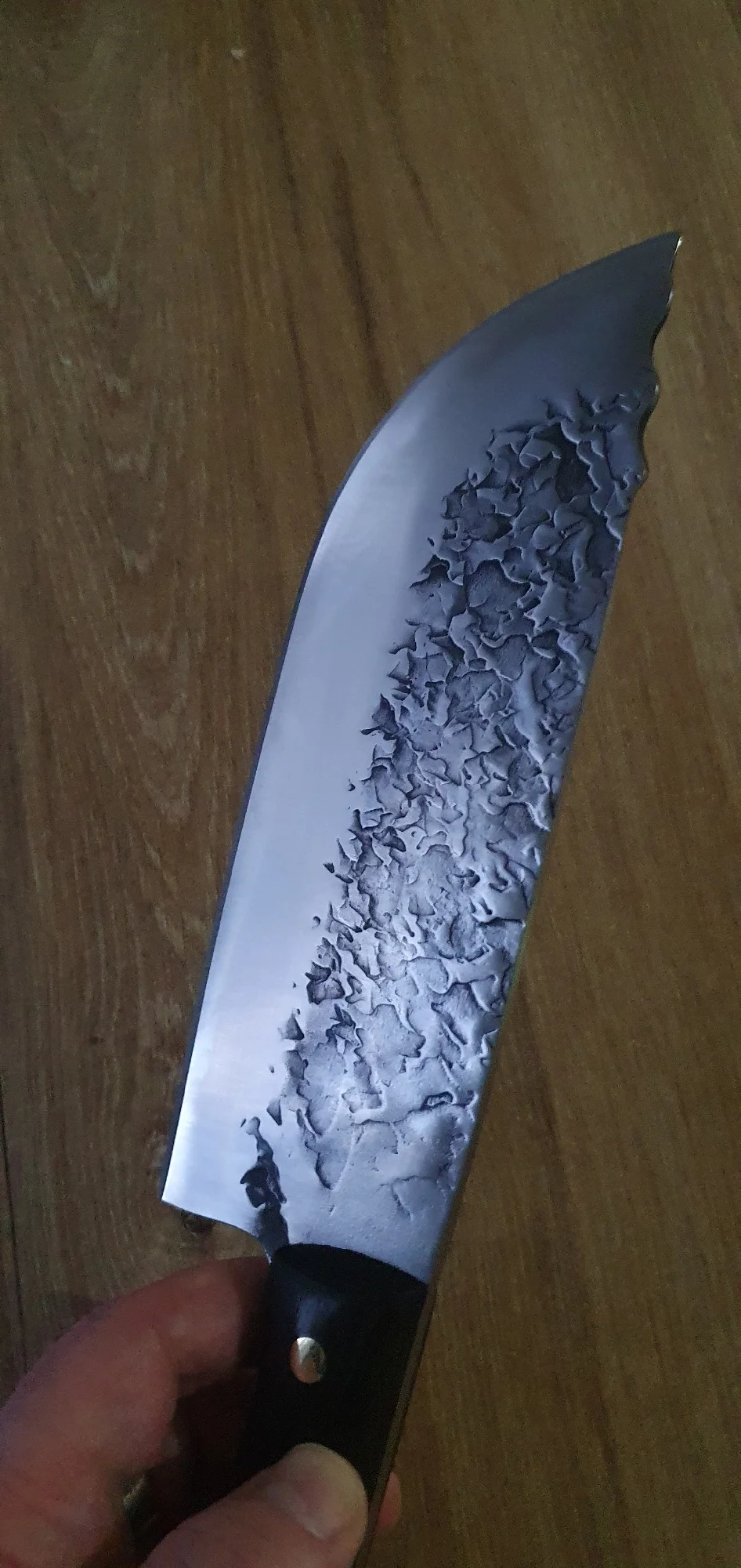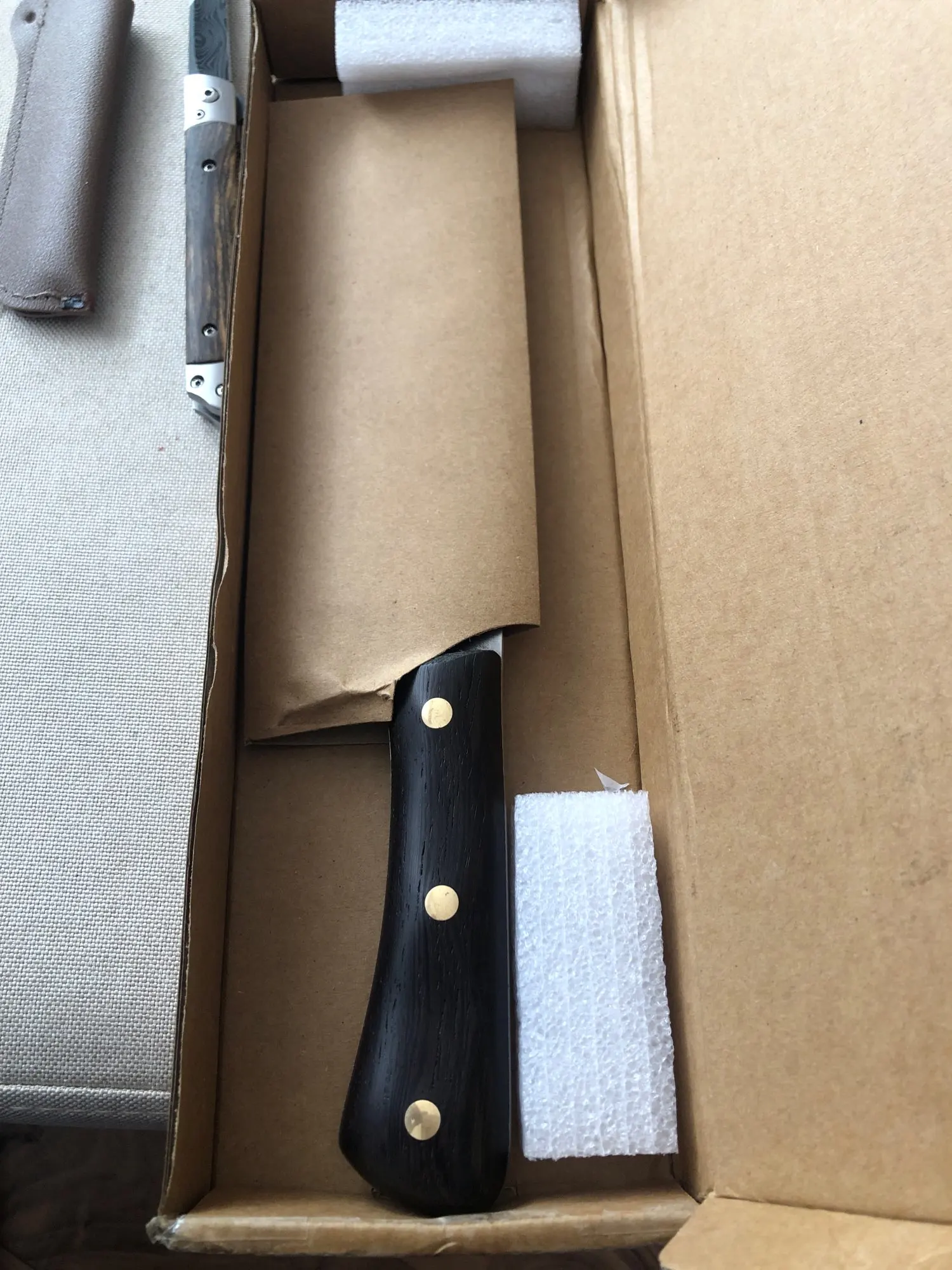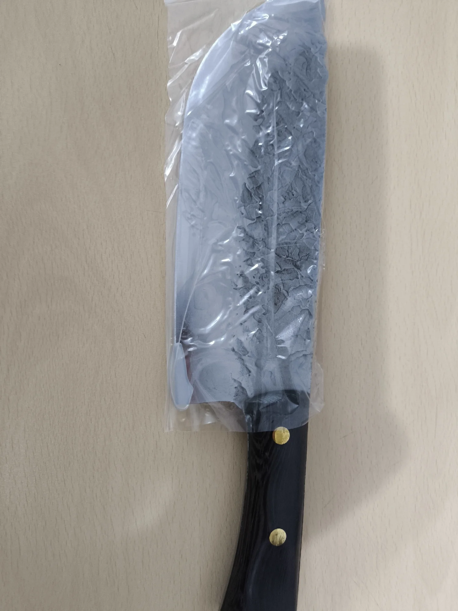 | DescriçãoComprimento total: 29,8 cm Comprimento da lâmina: 19,5 cm Comprimento da alça: 10,3 cm Espessura da lâmina: 2,8 mm Largura da lâmina: 6,3 cm Material da lâmina: aço inoxidável 5Cr15Mov Dureza da lâmina: 58±2HRC Acabamento da lâmina: forjado à mão Cabo: Fixação de madeira e rebite Peso: cerca de 319g Outros: faca de cozinha forjada chinesa Uso: fatiar carne, cortar vegetais, facas de cozinha de açougueiro e chef