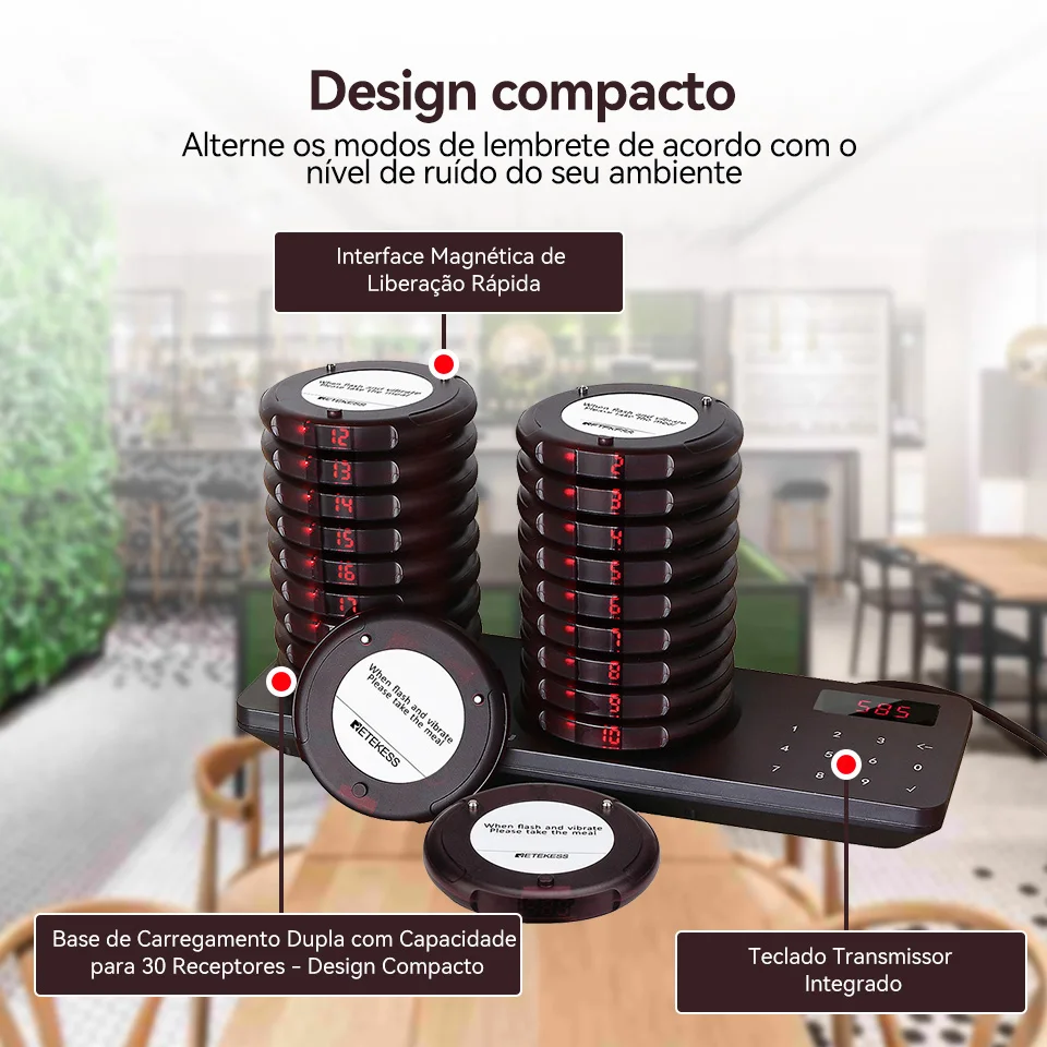 Várias bases transmissoras podem chamar o mesmo pager. Por exemplo, quando um cliente pede bebidas e comida ao mesmo tempo, os teclados transmissores na área de bebidas e na área de retirada de comida podem chamar um pager ao mesmo tempo, eliminando a necessidade dos garçons correrem de um lado para o outro, melhorando assim a eficiência do trabalho e reduzindo a ineficiência!