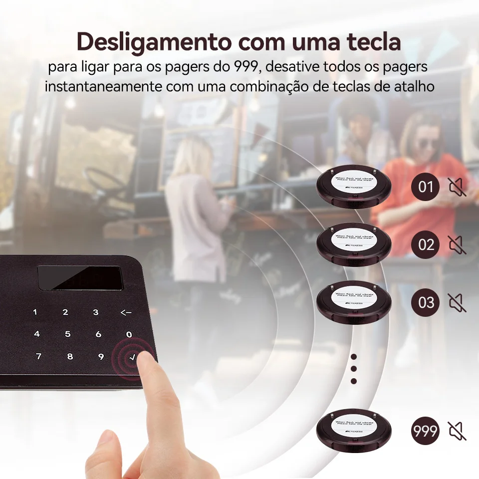 O silenciador com um toque é mais prático! O teclado do transmissor pode adicionar 999 pagers e silenciá-los com um botão. Ao ligar para vários convidados, você pode desativar o som de vários pagers ao mesmo tempo. Você não precisa desligá-los manualmente um por um, economizando mais tempo e melhorando a eficiência!